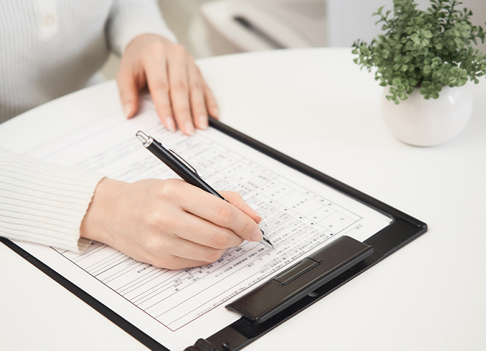 初診の場合、まず問診表に沿って患者様の心身の状況についてお聞きしながら問診表に記入させていただきます。